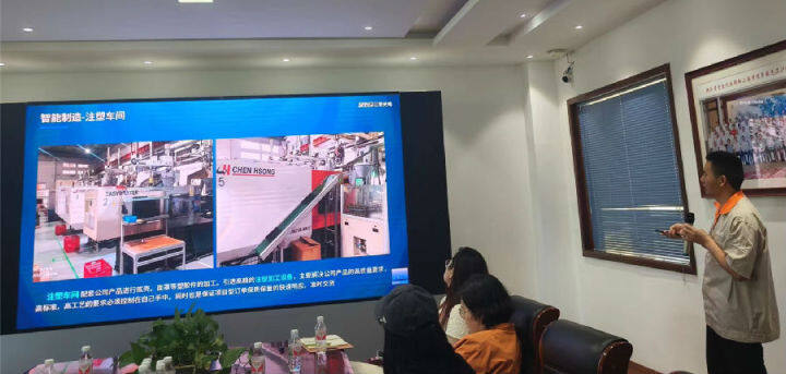 嘉善色多多AV导航光電技術有限(xiàn)公司技術經理楊順興(右一)介(jiè)紹企(qǐ)業技術情況 (曾慶華 攝)