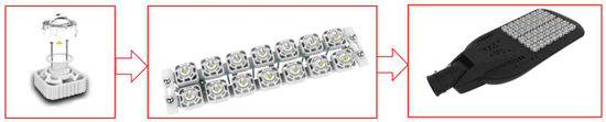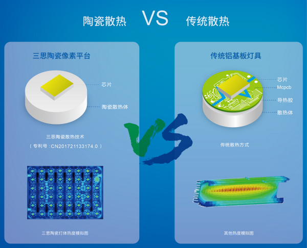 有別於(yú)市場上其(qí)他製造商(shāng)采用的傳統COB封裝工藝,上海(hǎi)三(sān)思獨立研發的陶基片(piàn)上單元(COC)技術,以陶(táo)瓷基板作為散熱體,采用厚膜燒結技術將導(dǎo)電線路直接燒結在陶瓷(cí)上,係統熱阻大大減小,同時將LED芯片直接貼在(zài)陶瓷上,熱量通過空氣對流直(zhí)接散發,散熱性(xìng)能遠遠高於傳(chuán)統PCB LED路燈。