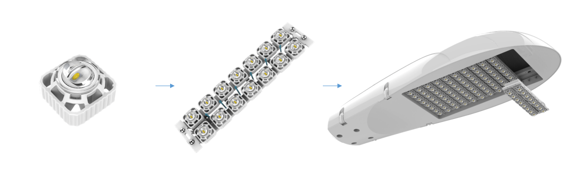 LED芯片(piàn)自封裝→單顆像素的光學設計,並成獨(dú)立(lì)發光體(獨立像素(sù)發光)→多顆像素組合成發光模組→根據應用環境需求配置不同功率的成品路燈頭。