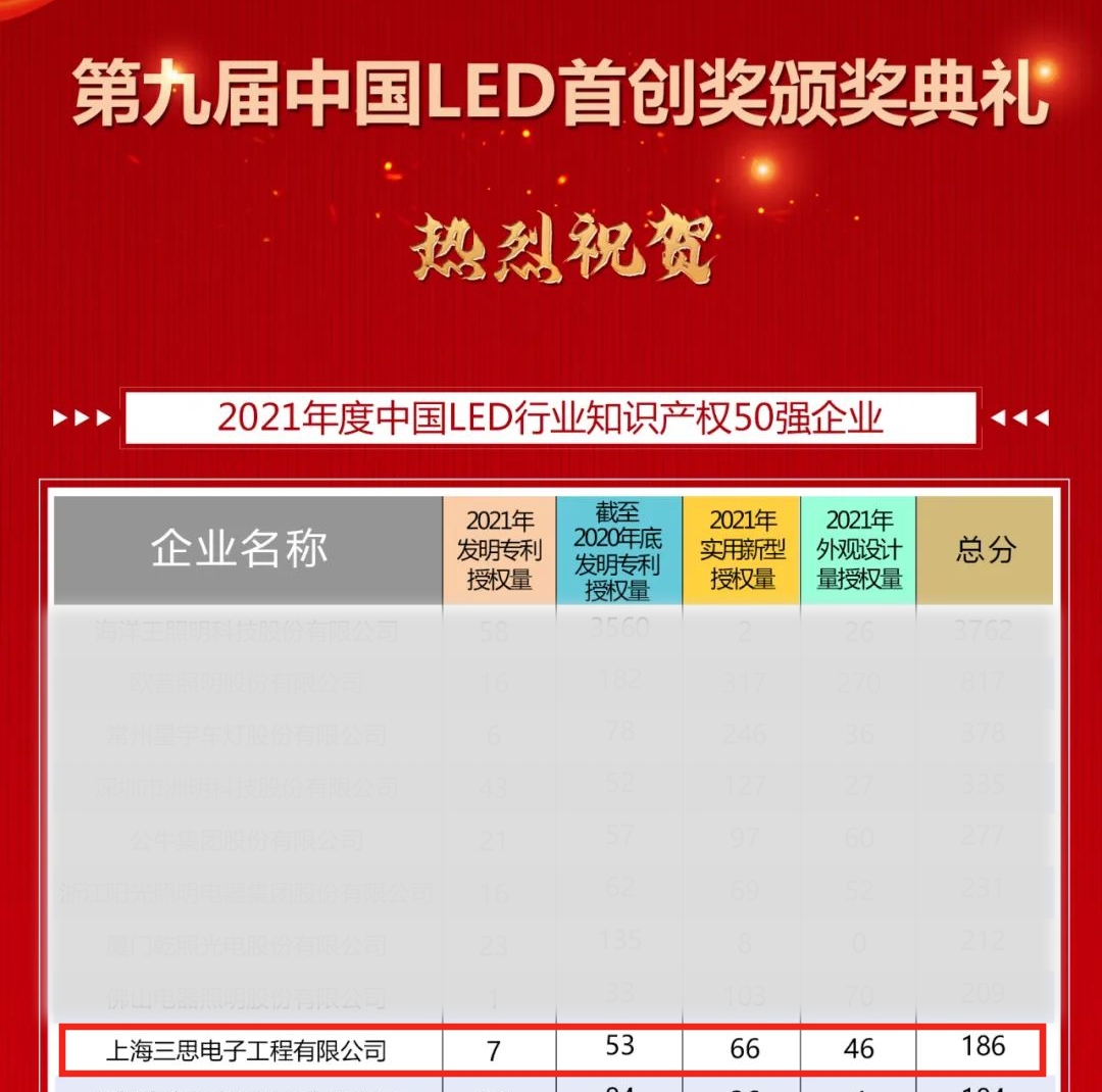 2022年8月3日,第九屆中國(guó)LED首創大會在廣州市廣交會展館隆重(chóng)舉行。大會(huì)上發布了“第九屆中國LED首(shǒu)創(chuàng)獎2021年度中國LED行業(yè)營收50強、知識產權50強榜單”,上(shàng)海三(sān)思強勢入圍前十強,獲評“2021年度中國(guó)LED行業知識產權50強企業”稱號。